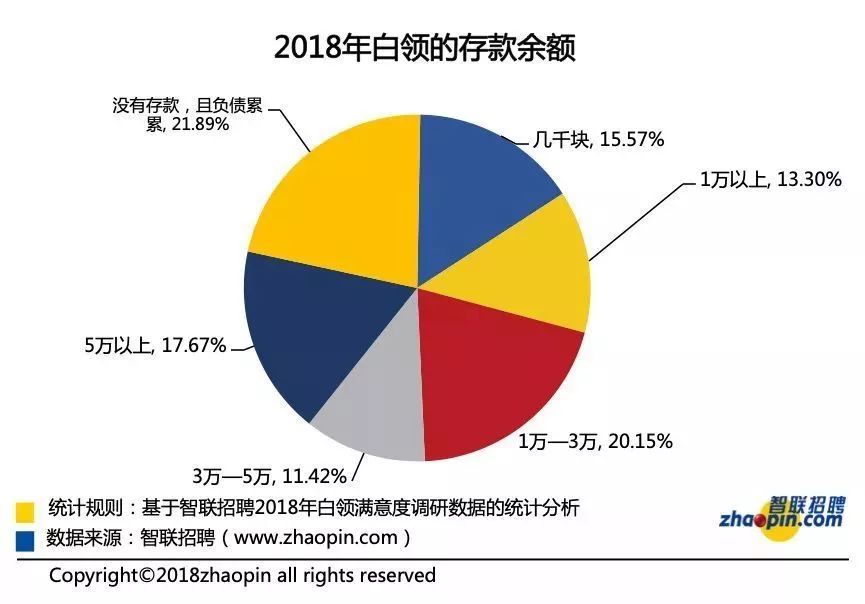 另据智联招聘《2018白领满意度指数调研报告》显示:2018年度存款超过3万元的白领仅占3成;21.89%的白领不仅没有存下钱,还欠了债务;存款余额为“1万-3万”的白领也只占20.15%。