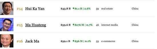 截至10月6日午间收盘,在香港上市的房地产开发商中国恒大报31.5港元/股,涨幅2.44%,总市值达到4137亿港元;融创中国报41.9港元/股,涨幅4.75%,总市值为1732亿港元。根据福布斯实时富豪排行榜显示,目前恒大集团董事局主席许家印以身价438亿美元坐稳中国首富位置,在全球富豪榜中排名第14位,紧跟其后的是腾讯公司董事会主席兼首席执行官,身价396亿美元,排名第15,阿里巴巴董事局主席马云以身价391亿美元排名第16位。