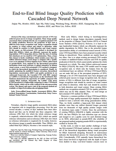 引用格式:J. Wu, J. Ma, F. Liang, W. Dong, G. Shi and W. Lin, "End-to-End Blind Image Quality Prediction with Cascaded Deep Neural Network," in IEEE Transactions on Image Processing, doi: 10.1109/TIP.2020.3002478.
