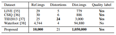 首先建立一个百万数量级的大型图像质量评价数据库。该数据集包含有10000张从MSCOCO中挑选的高清原图,21种噪声,1050000张污染图像,并基于多FRIQA算法融合的思想为每张污染图像计算了一个质量分值(pseudo-MOS)。表1中比较了论文建造的数据库与其他几种常见数据库。