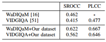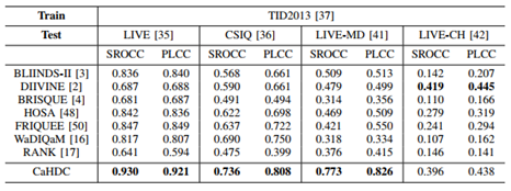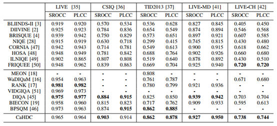 在5个公开的标准IQA数据库上验证了论文算法的性能。实验结果表明论文算法达到了与人类主观感知的高度一致性。尤其在跨库实验当中,该算法在大多数情况下取得了明显的优势。另外,使用论文建立的数据库重新预训练了其他算法,数据库可以有效的提升其他算法的泛化性能。实验结果见表2-4。