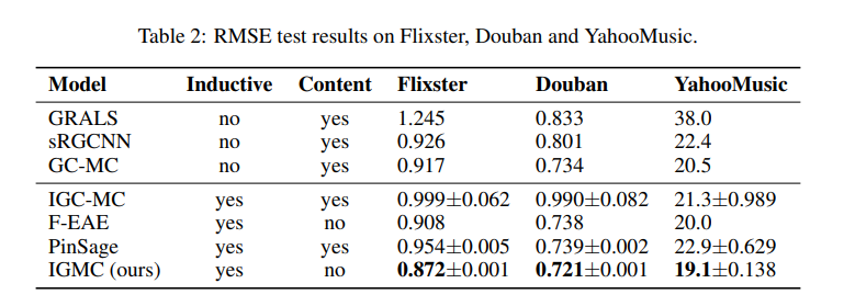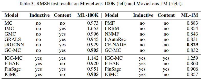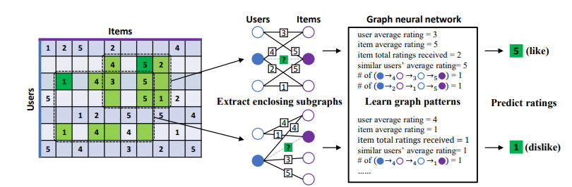 矩阵补全(Matrix Completion)被广泛应用于推荐系统中,本文提出的这篇IGMC为每一个(user, item) pair提取一个包含子图(enclosing subgraph),并用图神经网络(graph neural network)训练一个由子图结构映射到用户对商品评分(rating)的回归模型。IGMC在多个数据集上取得了最先进的性能.