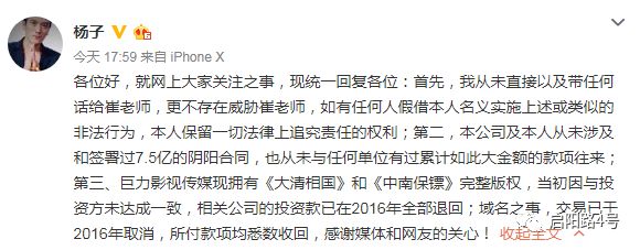 对于外界的阴阳合同的猜测,今日杨子微博回应称,其从未直接以及带任何话给崔永元,更不存在威胁崔永元。