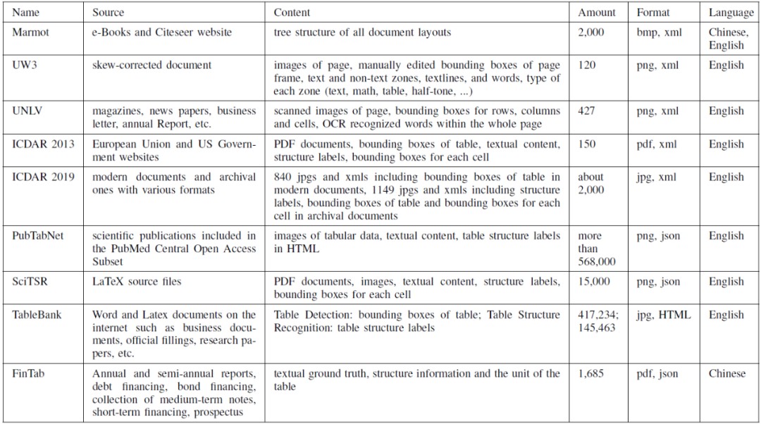 (7)TableBank 表格库[8]。TableBank 是基于图像的表格检测和识别数据集。由于涉及两个任务,所以它由两个部分组成。对于表格检测任务,包含了表格区域的页面和边框的图像。对于表格结构识别任务,提供了表示行和列的排列以及表格单元类型的页面和 HTML 标记序列的图像。然而,由于这个数据集不涉及文本内容识别任务,因此不包含文本内容及其边界框。