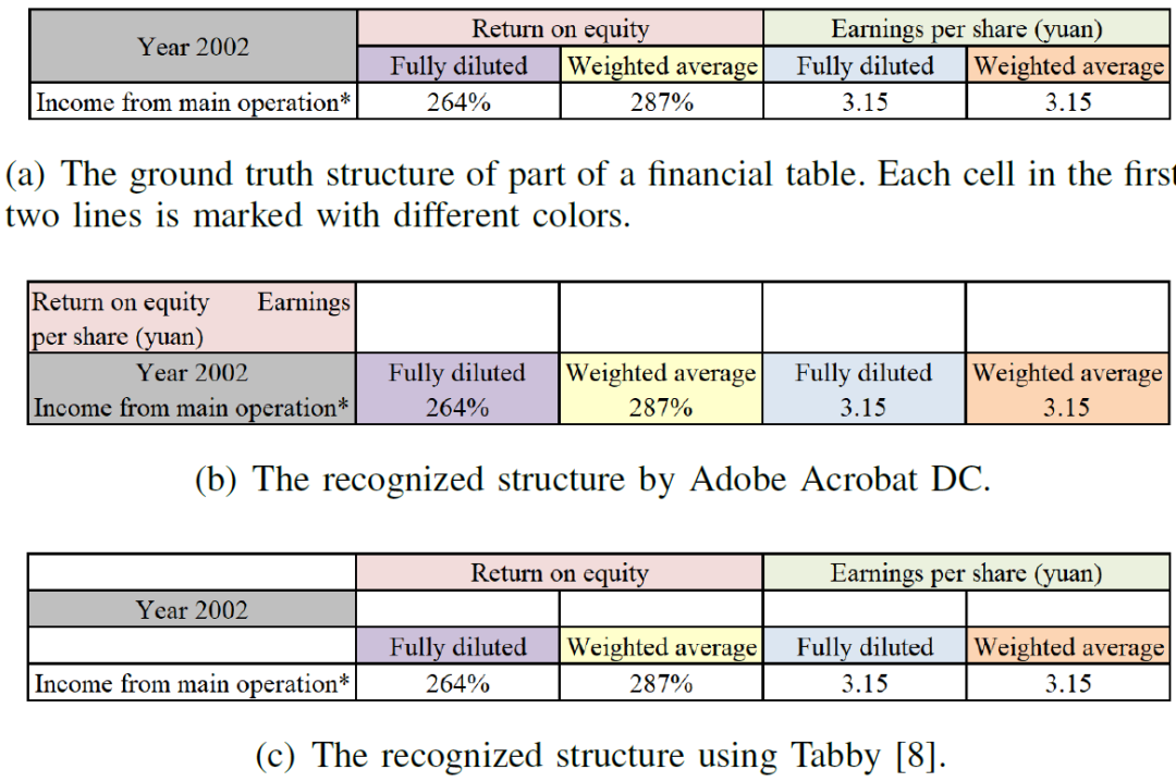 首先,作者给出了一个经典的表格识别问题示例。图 1 给出了两个已有的表格内容提取方法的效果,即 Adobe Acrobat DC 和 Tabby[1]。在示例中的表格应用这两种方法都无法正确提取表格内容。同时,不难发现在跨单元格的情况下,由于这些单元格很可能携带表头的信息,表格识别经常会出现问题。因此,表格抽取方法的性能仍有待提高,尤其是在复杂的情况下对于表格的提取和理解至关重要。
