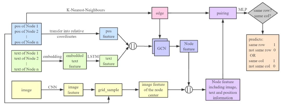 图 5 给出了基于图的卷积网络 GFTE 的结构。首先将绝对位置转换为相对位置,然后用这些位置来生成图。同时,将纯文本嵌入到预先定义的特征空间中,然后使用 LSTM 来获取语义特征。将位置特征和文本特征连接在一起,并将它们传送到一个两层图卷积网络(GCN)。同时,作者使用了一个小内核算子对图像进行膨胀,使表格的线条更粗。还将图像调整为 256x256 像素,以便使输入的图片正常化,然后利用三层 CNN 计算图像特征。最后,利用节点的相对位置,计算出流场网格。利用网格中输入的像素位置计算输出,可以得到某个节点在某一点上的图像特征。这三种不同的特征都得到后,将生成的图的一条边上的两个节点配对,即,找到一条边上的两个节点,并将它们的三种不同的特征集合在一起。最后,使用 MLP 来预测两个节点是在同一行还是在同一列中。