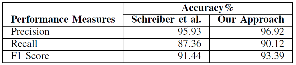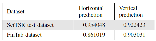本文实验是基于 ICDAR 2013 表格竞赛数据集完成的。作者根据召回率、查准率和 F1 分数对模型性能进行评价,对每个文档计算这些度量值,并在所有文档中取其平均值。本文使用的 Mamot Extended 数据集中共有 1016 份文件,包括中文和英文表格,其中 509 份英文文件附有注释,并用于训练。使用 Tensorflow 实现该深度学习模型,并在一个使用 Intel(R)Xeon(R)Silver CPU(32 核)和 128 GB Tesla V100-PCIE-1 GPU 的 RAM 和 6GB GPU 内存的系统上完成实验。