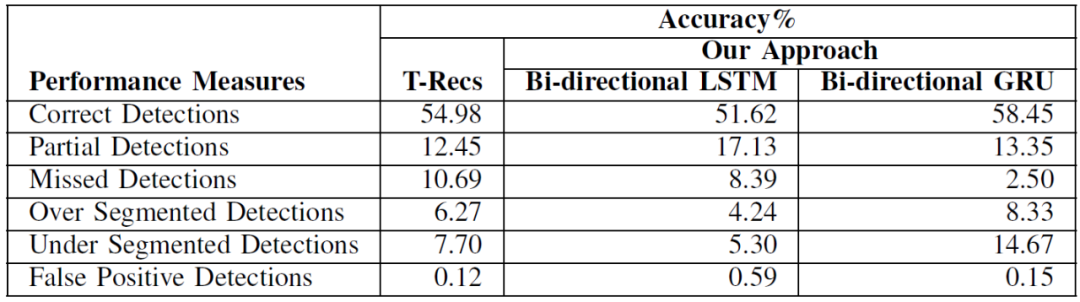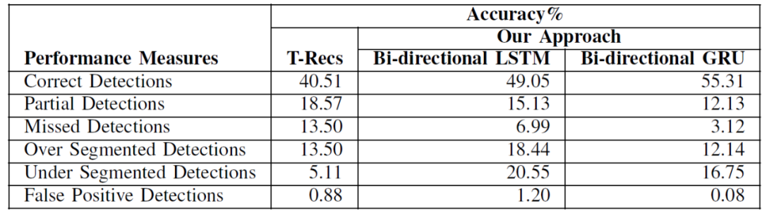 本文实验使用的是 UNLV 数据集。本文重点讨论的是表格识别问题中的表格结构提取,因此作者从 UNLV 库中的真实文件中裁剪得到 557 个表用于实验。作者使用 T-Recs 作为对比方法[11]。T-Recs 是一个用于表格结构提取的非深度学习方法。由表 1 和表 2 的实验结果可知,本文提出方法显著提高了列的检测准确度,准确度从 40.51% 提高到了 55.31%。在行检测的情况下,准确度从 54.98% 提高到了 58.45%。另一方面,与 T-Recs 方法相比,本文方法得到的结果中过分割和欠分割的数量更多,因此出现表格结构部分检测的情况减少了。