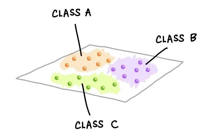 一个训练有素的分类模型将一组变量(定量或定性)作为输入,并预测输出的类标签(定性)。下图是由不同颜色和标签表示的三个类。每一个小的彩色球体代表一个数据样本。