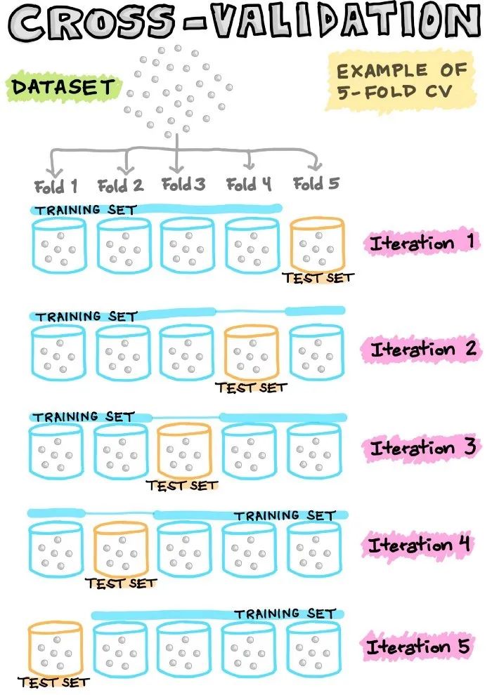 例如,在5倍CV中,有1个折被省略,作为测试数据,而剩下的4个被集中起来,作为建立模型的训练数据。然后,将训练好的模型应用于上述遗漏的折(即测试数据)。这个过程反复进行,直到所有的折都有机会被留出作为测试数据。因此,我们将建立5个模型(即5个折中的每个折都被留出作为测试集),其中5个模型中的每个模型都包含相关的性能指标(我们将在接下来的部分讨论)。最后,度量(指标)值是基于5个模型计算出的平均性能。