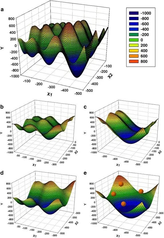 "原搜索空间(a)x∈[-500,0]在每个维度上以2的固定间隔拼接成子空间(图中一个维度等于一个横轴)。这样就得到了4个子空间(b-e),其中x在每个维度上的范围是原始空间的一半。GA的每一个字符串都会编码一个子空间的索引。然后,GA启发式地选择一个子空间(e),并在那里启动PSO(粒子显示为红点)。PSO搜索子空间的全局最小值,最好的粒子适应性作为编码该子空间索引的GA字符串的适应性。最后,GA进行进化,选择一个新的子空间进行探索。整个过程重复进行,直到达到满意的误差水平。"
