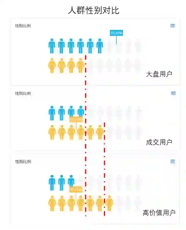 首先,我们想看看成交的这部分用户与大盘用户之间有什么区别。我们在用户中选出成交的用户,建立用户群对比大盘用户。
