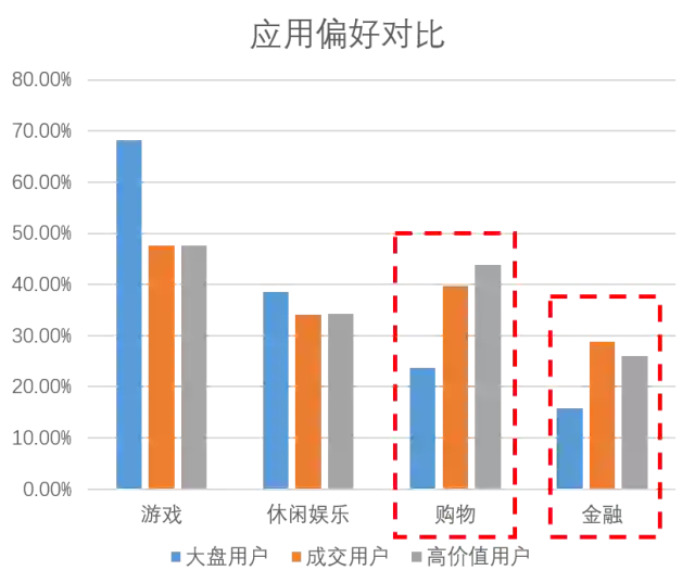 从图中我们可以发现,大盘用户中男性较多,但实际成单与高价值用户中,都是女性偏多,且此部分用户对购物类App、金融类App的兴趣要明显高于大盘用户,表现出了较强的消费能力。
