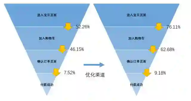 优化投放渠道前后,购买转化漏斗转化率的改变: