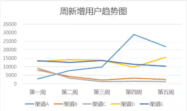 在投放一周后,对新增用户有了增长,我们临时决议再次加大渠道A的投放比例。这里是一个月的时间周期内,我们的新增用户数在渠道上的分布有了显著变化。