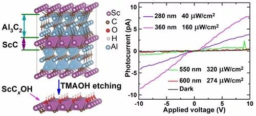 中国科学院宁波材料技术与工程研究所先进能源材料工程实验室前期的理论工作表明,Sc2C是MXenes体系中唯一一个半导体特性不依赖于表面官能团的组员,此外羟基官能化的Sc2COH被预测具有直接带隙特性。但是,过渡金属Sc很难形成相应的含Al的MAX相结构。最近,瑞典林雪平大学团队通过将Sc引入三元Mo-Al-C系统,分别合成了面外有序的o-MAX和面内化学有序的i-MAX层状材料,基于选择性刻蚀法又相继获得了Mo2ScC2Tx和Mo1.33CTx MXenes,但在含氟化物的溶液中同时发生了Al和Sc原子的选择性蚀刻。以上工作表明基于传统思路,在腐蚀性含氟溶液中选择性蚀刻MAX相来合成全Sc系MXene非常困难。因此,通过结构设计获得可刻蚀的前驱体,并建立温和相容的刻蚀化学对获得全Sc系MXene非常重要。先进能源材料工程实验室利用一类新型非MAX相层状材料作为前驱体,通过刻蚀Zr3Al3C5及Hf3(AlSi)4C6中的Al(Si)-C亚层的全新路径,相继在MXenes体系中引入了Zr3C2Tx (Angewandte Chemie International Edition, 128 (16), 5092-5097)及Hf3C2Tx (ACS nano11 (4), 3841-3850) MXenes组员。在此基础上,实验室研究人员合成了类MAX相结构的ScAl3C3前驱体,在相对温和的有机碱液TMAOH中,选择性刻蚀ScAl3C3相中的Al-C亚层获得了二维全钪系碳化物ScCxOH。通过光电子能谱、电子能量损失谱及透射电镜等表征手段证实其表面主要含-OH官能团。与瑞典林雪平大学教授Per Persson团队合作,基于价电子能量损失谱(VEELS)及阴极荧光光谱(CL)证实该新型Sc系二维碳化物具有约2.5eV的直接带隙。与日本国立材料研究所教授廖梅勇团队合作,以剥离态的几层结构ScCxOH片层制作了光探测器件,发现其在紫外可见光区域具有良好的光电响应性(0.125A/W,10V,360nm)及高量子效率(~43%),瞬态响应良好,无明显缺陷阱效应。该材料的响应率与基于石墨烯、少层MoS2及GaSe等二维材料制作的光探测器具有可比性,且接近传统的GaN薄膜光探测器件(0.148 A W-1, 51%)。具有适中带隙值的直接带隙半导体型ScCxOH材料有望在可见光探测器及光催化等领域获得应用。