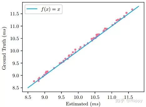 由于该搜索空间中每个模块均具有固定的输入,因而可以采用统计延迟方式制作查找表。然后将延迟采用逐层累计方式得到模型的延迟耗时。GPU实际延迟与预测耗时对比见下图,误差不大于0.0571ms.