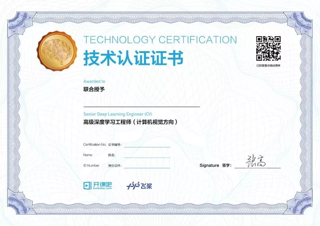 本课程通过考核,获得足够学分的优秀学员将取得含金量极高的《开课吧 - 百度飞桨资深AI工程师证书》,完成学习的学员将有能力直接报考“百度深度学习认证考试”。