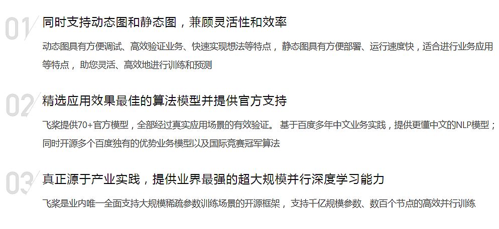 飞桨(PaddlePaddle)是集深度学习核心框架、工具组件和服务平台为一体的技术先进、功能完备的开源深度学习平台,提供丰富的官方支持模型集合,并推出全类型的高性能部署和集成方案供开发者使用: