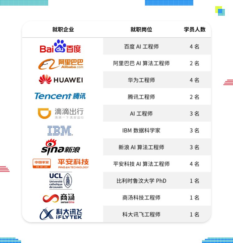 目前学院的毕业生,有求职意愿的学员中80%同学已经拿到国内外名企AI、算法相关Offer 或国外名校 AI 相关录取 Offer,已就业同学平均薪资超过27万。