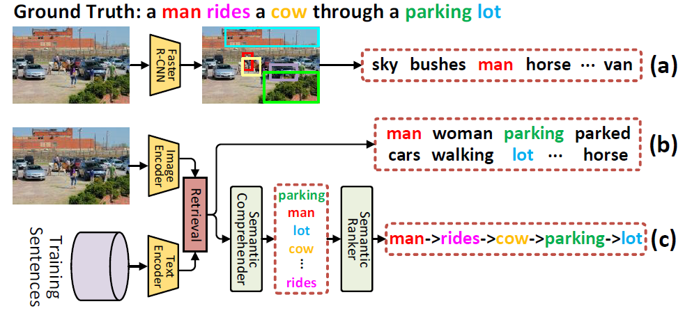 理解图像中丰富的语义并将其按照语序进行排列对于生成视觉相关且语言连贯的描述至关重要。现有的图像描述方法大多依赖一个预训练的目标检测器或者分类器来挖掘图像中的视觉语义,而往往忽略了这些语义之间的语序关系。我们在论文中提出了一个基于Transformer结构的新方案,称为语义理解与排序网络(Comprehendingand Ordering Semantics Networks,COS-Net)。COS-Net新颖地将强化语义理解以及可学习语义排序过程集成到了一个统一网络中。COS-Net先利用一个跨模态检索模型来为每一张图像检索相关的句子,然后这些句子中的词语构成初始的语义线索,然后利用一个全新的语义理解器过滤不相关的语义线索,同时推测图像缺失的相关语义词语并加入到语义线索。接着,语义线索中剩下的所有词语会被输入到一个语义排序器中,该排序器通过学习人类的语序习惯来为这些词语进行自动排序。最后,排序后的语义词语序列结合图像的视觉信息用于生成图像描述。COS-Net在COCO数据集上能够很明显地超过现有的前沿算法,在测试集上的CIDEr分数达到了141.1%。