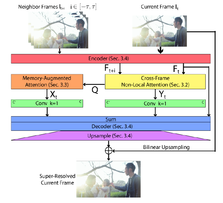 本文提出了一种简单有效的从低分辨率视频恢复高保真和高分辨率视频的方法。已有方法主要利用时域相邻帧来辅助关键帧的超分辨率,但由于在空间对齐相邻视频帧难度较大,并且同为低分辨率的相邻视频帧可以提供的有用高频信息有限,现有视频超分辨率性能受到了限制。针对这个问题,我们提出了一种跨帧注意力机制,可以在不进行显式空间对齐相邻帧的情况下进行视频超分辨率,在包含较大运动的视频中展现出了出色的鲁棒性。另外,为了获取输入低分辨率视频的之外的图像细节信息,并对运动视频中信息损失进行补偿,我们提出了一种全新的记忆增强机制,以在网络训练阶段记忆通用的视频图像信息,辅助测试过程中的视频超分辨率。经过在多个有挑战性的视频数据集进行大量的评估,与当前最先进的视频超分辨率方法相比,我们的方法不仅具有显著的性能提升,并且对不同类型的实际视频中有很好的通用性。
