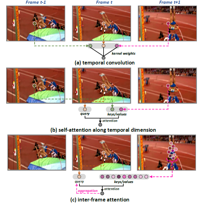 如何捕捉视频的动态信息是视频模型发展的关键。当下基于神经网络的视频模型主要通过两种方式进行动态建模。其一是利用时空三维卷积或者是分解的时空三维卷积(空域卷积+时域卷积)对动作进行捕捉,另一种是在时域上利用自注意力机制进行动态建模。但这两种技术都基于一个隐含的假设,那就是空间中的特征在连续帧之间能够很好地进行对准并完成聚合。但在现实情况中这种假设很难维持,特别是对于空间上形变比较大的动作而言。所以,本工作从这点出发,设计一种可独立使用的可变形帧间注意力机制(Stand-alone Inter-Frame Attention (SIFA)),利用对帧间动作形变的预估帮助局部注意力的精确计算,从而提升模型对时空动作建模的性能。具体而言,SIFA通过利用相邻两帧的差值信息估计位移来重塑形变自注意力机制。如果将当前帧的每一个位置作为查询项(query),那么下一帧的该位置的领域局部区域将被视作关键项/真值项(keys/values)。其后,SIFA计算查询项和关键项的相似度,作为自注意力权重,用于真值项的时域聚合。我们进一步将SIFA模块插入到卷积网络和Transformer网络中,得到SIFA-Net和SIFA-Transformer结构。在四个动作识别数据集上的大量实验证明了SIFA-Net和SIFA-Transformer结构的优越性。更值得注意的是,SIFA-Transformer在Kinetics-400数据集上达到了83.1%的分类准确率。