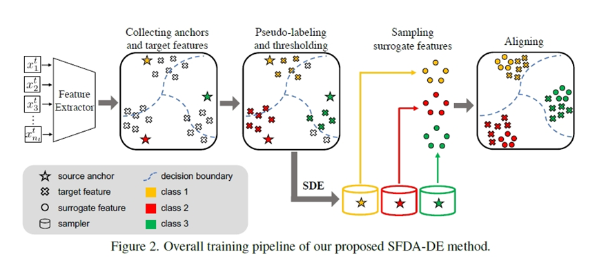 域适应旨在将从带标签的源域学到的知识迁移到数据分布不同的无标注的目标域。然而,由于隐私保护政策,大多数现有方法所需的源域中的训练数据通常在实际应用中不可用。最近,无源域适应(SFDA)引起了广泛关注,它试图在不使用源数据的情况下解决域适应问题。在这项工作中,我们提出了一个名为 SFDA-DE 的新框架,通过源分布估计来解决 SFDA 任务。首先,我们使用球形k-means聚类为目标数据生成鲁棒的伪标签,其初始类中心是预训练模型分类器学习的权重向量(锚点)。此外,我们建议通过利用目标数据和相应的锚点来估计源域的类条件特征分布。最后,我们从估计的分布中采样替代特征,并通过最小化对比适应损失函数来对齐两个域。大量实验表明,本文提出的方法优于需要大量源数据的传统域适应方法,在多个域适应基准上达到了最先进的性能。