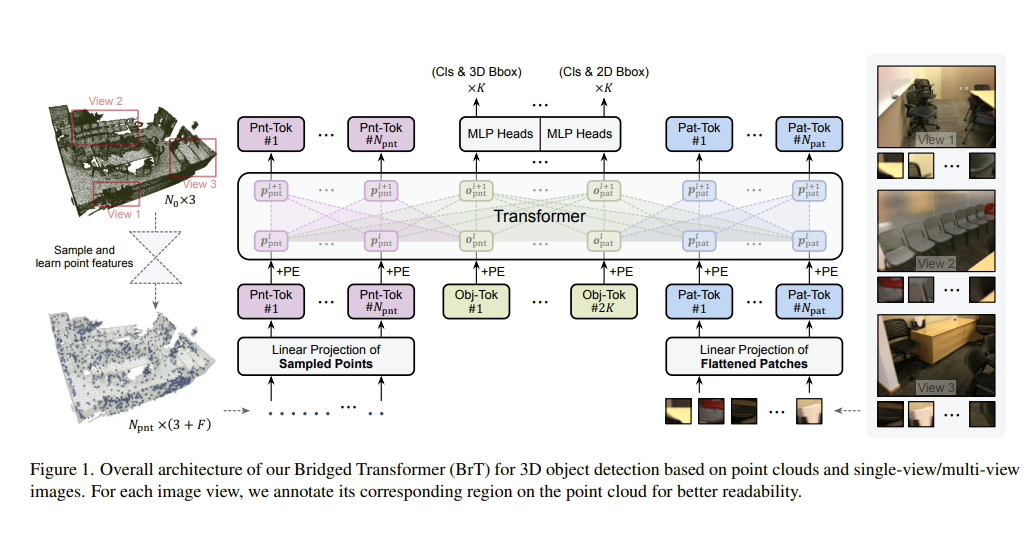 三维检测是计算机视觉领域的重要研究课题,在传统的研究设置中常常基于三维点云进行学习。最近,在三维检测的研究中有一种利用多种来源输入数据的趋势,例如使用色彩图像来对点云进行补充。然而,由于二维和三维表示具有异构的几何结构,使得现成的神经网络模型难以被直接用于实现图像-点云融合。为此,我们提出了桥接Transformer(BrT),一种用于三维检测的端到端架构。BrT是一种简单有效的方法,它可以同时从点云和图像中学习识别三维和二维物体的检测框。BrT的一个关键要素在于使用目标索引来桥接三维和二维特征,这将不同数据源的数据表示统一在一个Transformer中。我们采用了一种通过点到图像的投影实现特征聚合,进一步加强了模态之间的相关性。实验表明,在SUN RGB-D和ScanNetV2数据集上,BrT超过了已有的先进方法。