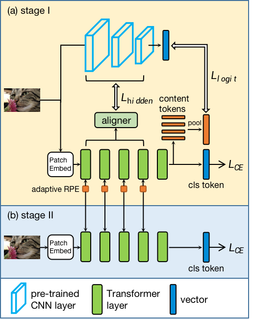 Transformer在视觉领域取得了巨大进展,然而却需要巨大的数据量,因此我们针对视觉Transformer提出了一种早期知识蒸馏框架——DearKD,来提升其在不同数据量下的性能,降低对数据量的敏感度。DearKD包含两个阶段,在第一阶段我们通过蒸馏卷积网络隐藏层与输出层的知识使得Transformer学到卷积网络的归纳偏置降低网络的数据依赖性,在第二阶段我们让网络学习自身固有的归纳偏置以提升网络的最终性能。此外,DearKD还可以被应用在极端的无数据场景下,在这个场景下,我们提出了边界保持的多样性损失函数以提升生成样本的多样性的同时保证样本是真实性,使得样本更贴近真实数据。我们在ImageNet全部与部分数据、无数据以及下游任务上均取得了SOTA的性能。