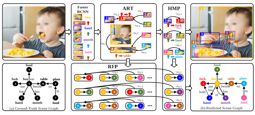 场景图生成(SGG)旨在检测图像中的物体并预测每对物体之间的关系。现有的 SGG 方法通常存在两个问题:1) 由于图神经网络的消息传递 (GMP) 模块对虚假(错误)的节点间联系比较敏感,导致物体表征变得模棱两可;2) 由于类别不均和标签缺失,导致关系预测的多样性降低。为了解决这两个问题,我们在文章中提出了一个正则化展开网络(RU-Net)。首先,我们从unrolling算法的角度出发,研究了 GMP 与图拉普拉斯去噪 (GLD) 之间的关系,推导出GMP可以表述为 GLD 的求解器。基于这一证明,我们提出了一个基于unrolling的消息传递模块,并引入了一个基于p-范数的图正则化项来抑制节点之间的虚假连接。其次,我们提出了一个group(组)多样性增强模块,通过秩最大化来提升关系预测的多样性。大量实验表明,RU-Net 在各种设置和指标下都是有效的。除此之外,RU-Net 在三个流行的数据库:VG、VRD 和 OI 上达到了最高的性能。同时,代码将在 GitHub 上发布。