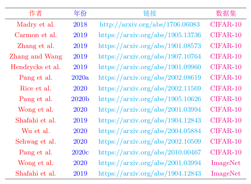比赛方通过15个防御模型测试选手提交的攻击算法,其中包括13个在CIFAR-10上训练的模型和2个在ImageNet上训练的模型,比赛方将会利用CIFAR-10测试集的前1000个数据和ImageNet ILSVRC 2012验证集中随机挑选的1000个数据进行测试。为了方便查阅我将其整理成如下表格: