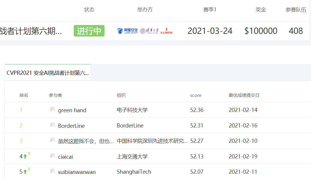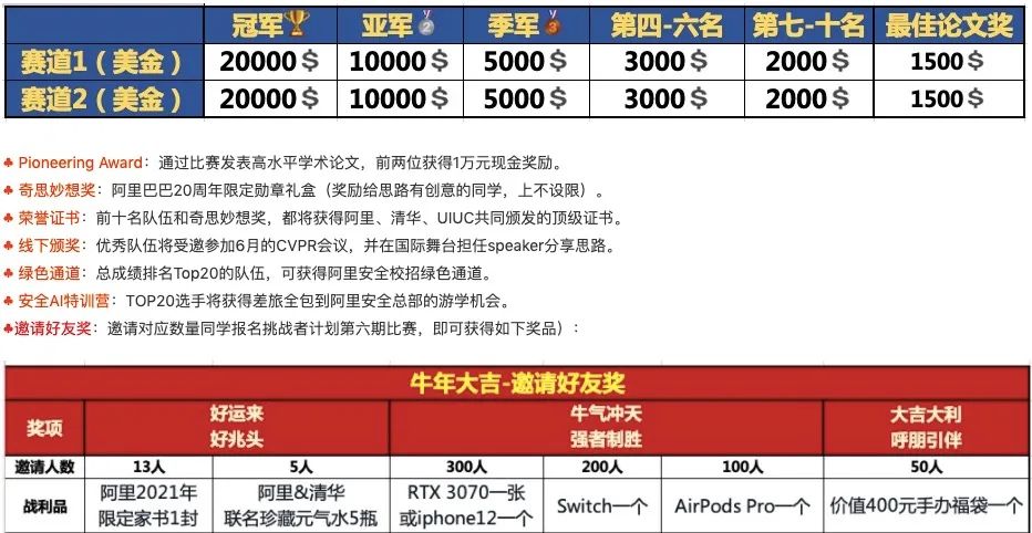 阿里安全、清华大学和UIUC共同主办CVPR2021安全AI挑战者计划第六期,打造AI安全国际赛事。共计10万美金现金奖励,召集“挑战者”以攻击者或防守者的身份共同打磨AI模型安全;为广大安全爱好者提供数字基建安全的试炼场,在高难度的真实环境中提升技术。