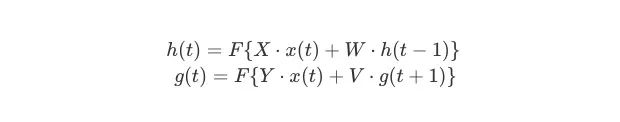 用1-of-N encoding对输入文本中的单词x(t)编码,把x(t)转成N维稀疏向量。此时,x(t)左侧的上下文向量h(t − 1)维数为H,它包含前一个时间步的隐藏层中输出值信息的内部表示;x(t)右侧的上下文向量g(t + 1)维数也是H,它包含下一个时间步的隐藏层中的右侧上下文输出值信息。网络在当前时间步计算隐藏节点的输出值,如下所示: