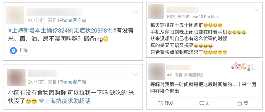 疫情期间许多商家在微博等渠道发布了团购信息,社区志愿者可以根据这些信息在社区内部发起团购。