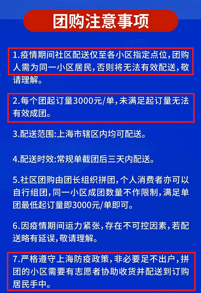 由于运力紧张和管制要求,商家一般会规定团购份数,并配送至小区指定点位,和志愿者对接。