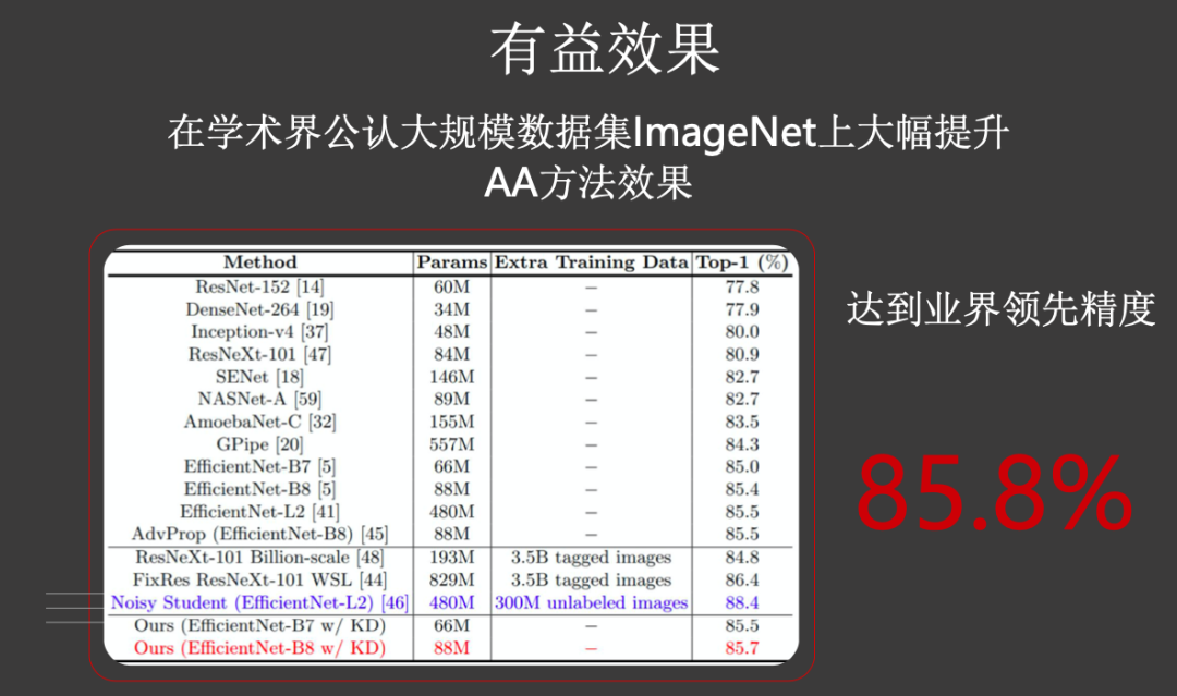 从结果上来看,这种知识蒸馏与自动数据扩增相结合的方法,在ImageNet上能够取得85.8%的效果。
