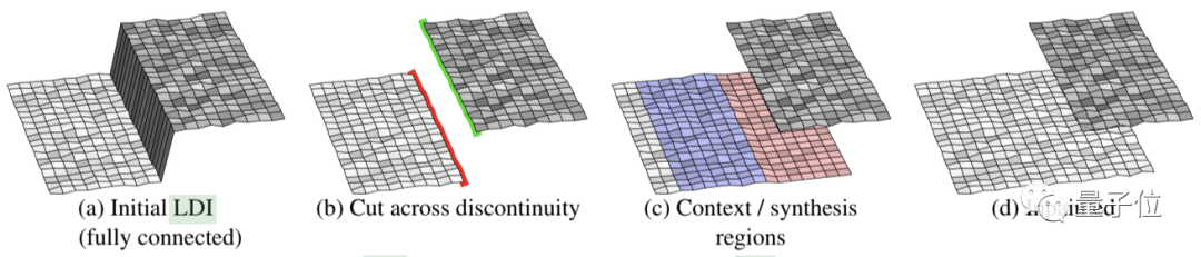 初始化并切割分层深度图像(LDI),使其形成前景轮廓和背景轮廓,然后,仅针对边缘的背景像素进行修补。从边缘“已知”侧提取局部上下文区域,并在“未知”侧生成合成区域(如下图c所示)。