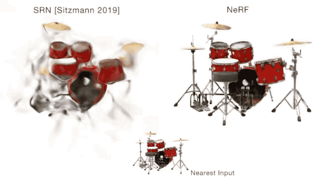 正所谓没有对比就没有伤害,下面便是NeRF分别与SRN、LLFF和Neural Volumes三个方法的效果比较。