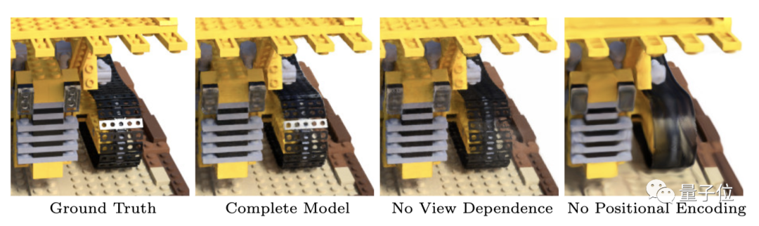这样做的好处可以通过对比来体现。可以看到,如果去掉视点相关,模型将无法重现镜面反射;如果去掉位置编码,就会极大降低模型对高频几何形状纹理的表现能力,导致渲染出的外观过于平滑。