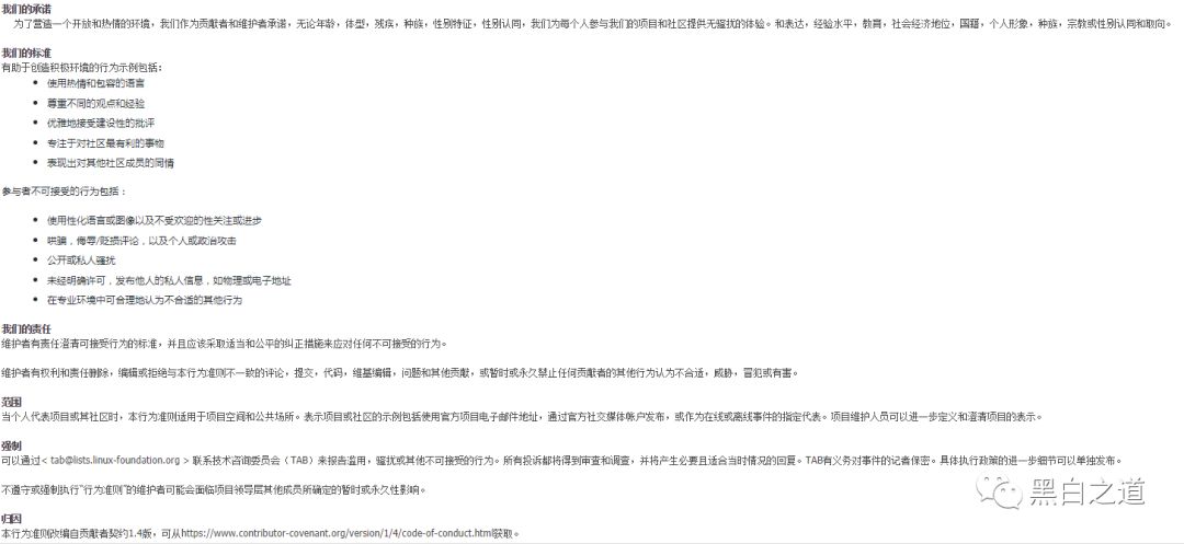 Linux官方随后也紧急处理,迅速停站维护。在Linux被黑之前9月份他们发布了一条新的COC准则通知,大概意思是旨在营造一个开放而热情的环境,为项目和社区的每位参与者创造免受骚扰的体验,无论其年龄、体型、残疾、种族、性别特征、性别认同和性别表达、经验水平、教育、社会经济地位、国籍、外表、种族、宗教,或性认同和性取向。具体信息如下图: