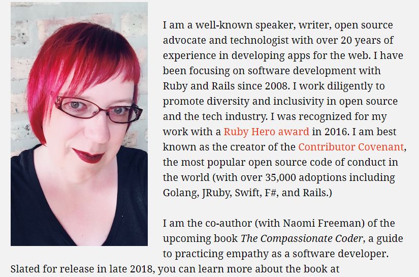而Coraline Ada Ehmke又是谁呢?资料显示,贡献者盟约由 Coraline Ada Ehmke 创作,她是一个软件工程师,开源支持者,以及 LGBT (代表女同性恋,男同性恋,双性恋和变性者)活动家。并且在开源领域的多样性做出了显著的贡献。她在个人介绍页面中介绍到,自己是一位著名的演讲者,作家,开源倡导者和技术专家,在2014年进行了变性,并且将这段经历公开,希望能让追随她道路的人更容易走下去。