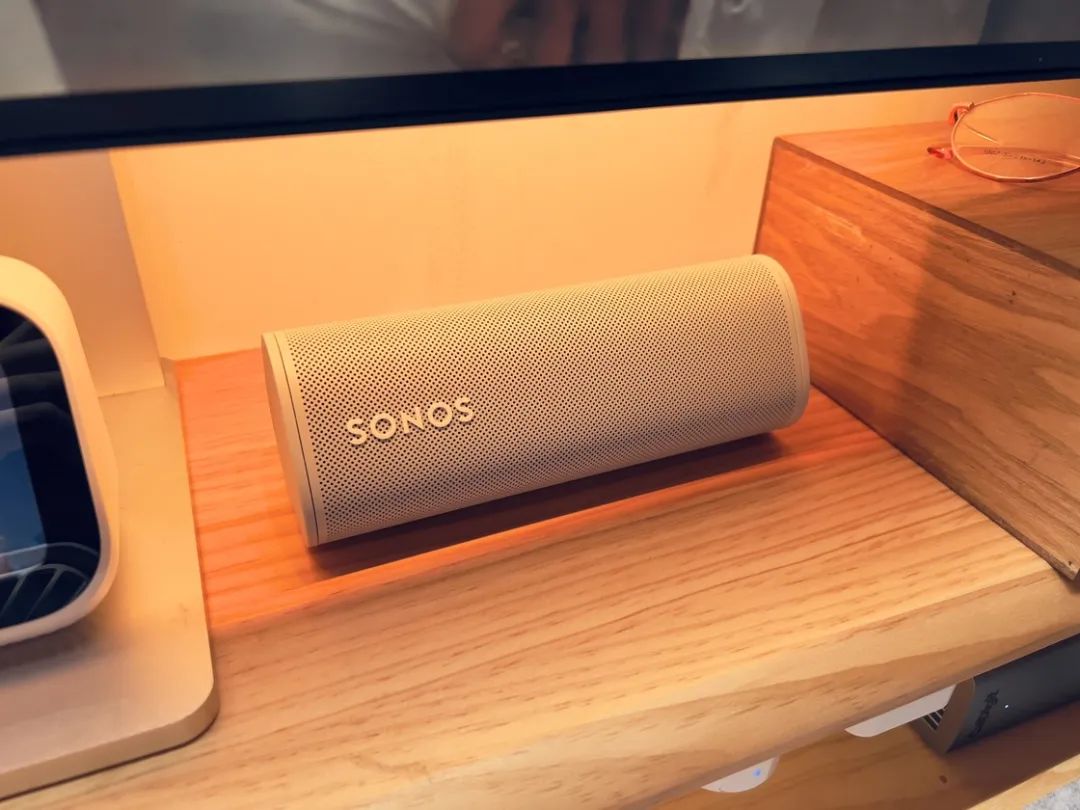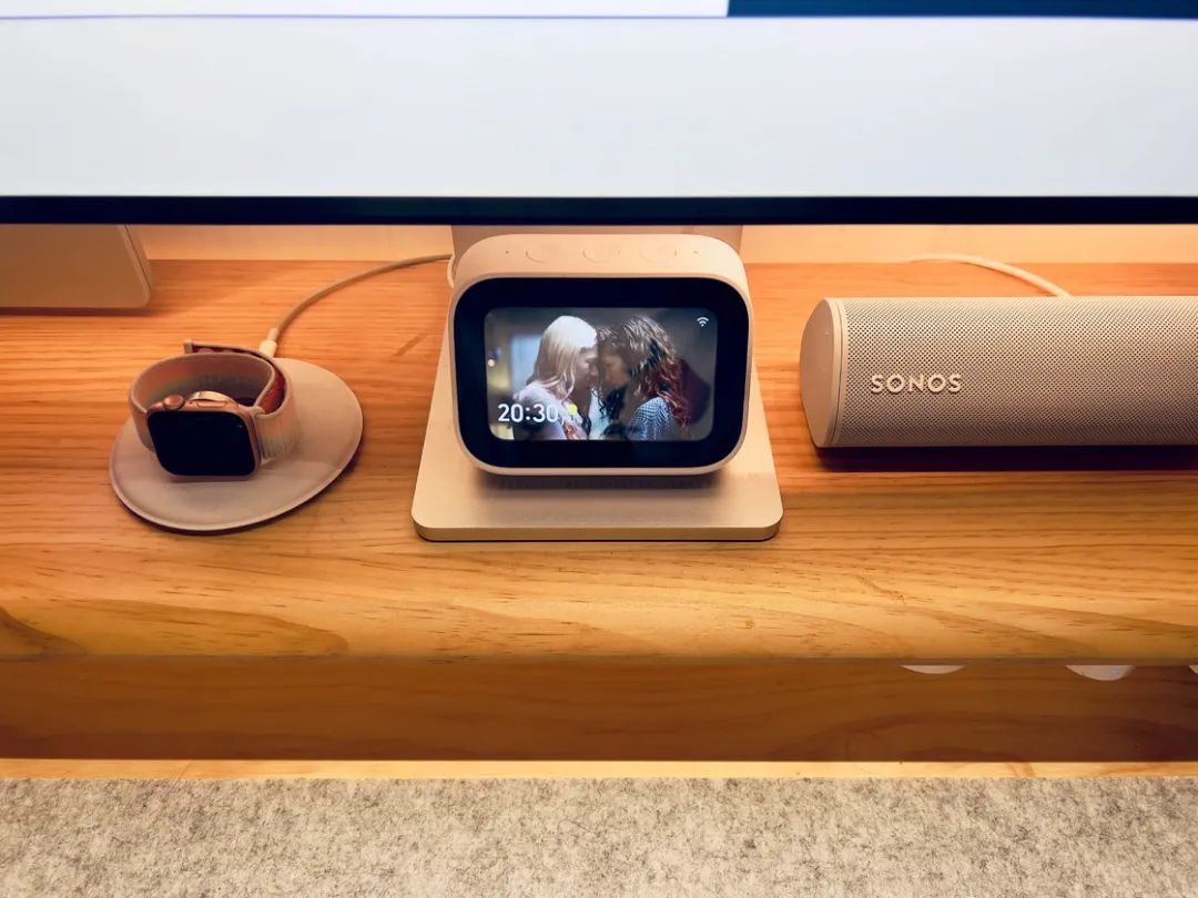 除此之外,它白灰穿插的颜色搭配,也很契合新的主题风格,与屏幕下方同样是白灰配色的 SONOS Roam SL 就像是对门的表兄弟。而说到 SONOS,就不得不说新桌面关于声音系统选择上的一些踱步与徘徊。