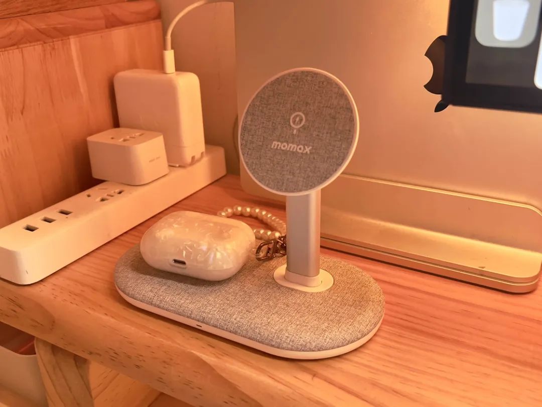 答案是屏幕的左侧的手机支架上。摩米士的这款磁吸充电底座其实并不支持 Magsafe,但与它结识可以说是命中注定一般,因为它是一众磁吸充电配件中唯一对胃口的选择。似乎绝大部分的厂商都约定俗成地把无线磁吸充电底座中手机的位置放在了左边,而右置位的则妥妥地被划归到了少数派。