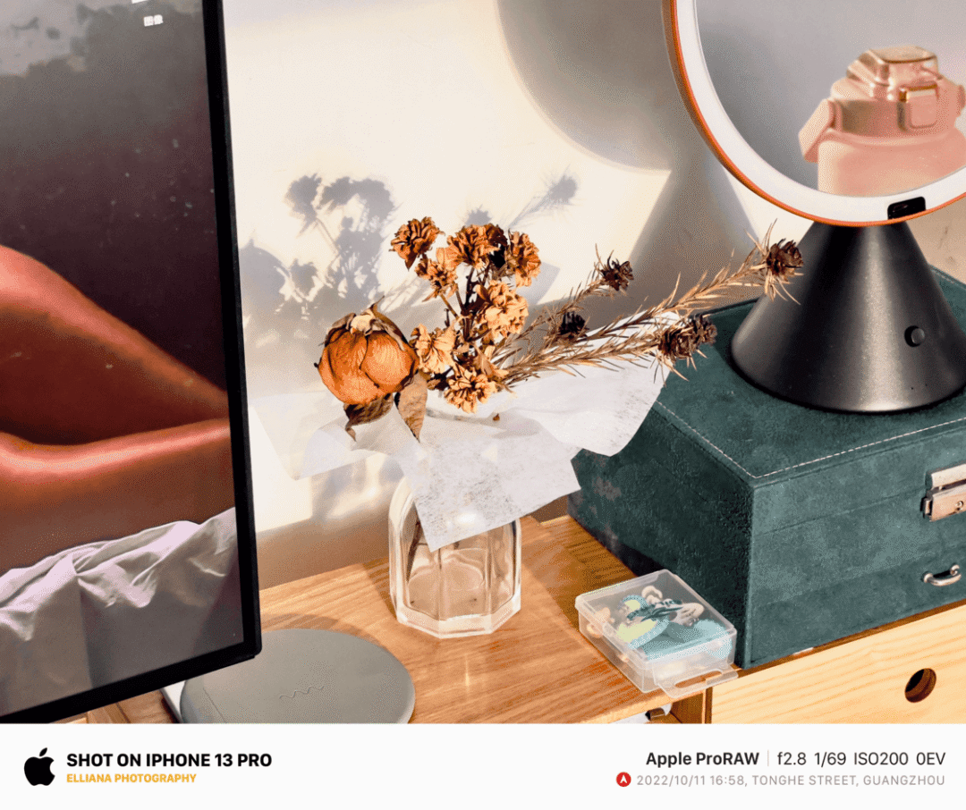 如果能将化妆桌布置在靠近窗户的区域,那必然是最优选。可我房间中靠窗的部分已经被床铺占据,因而只能背对窗户布局。而这时候,上面无主灯照明的好处在这里也同样显现了出来:它点亮的区域是成片状散布的,经过房间内其他物品的漫反射,自然地就形成了类似太阳光的效果。