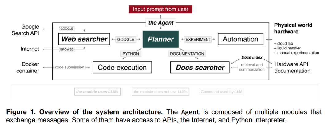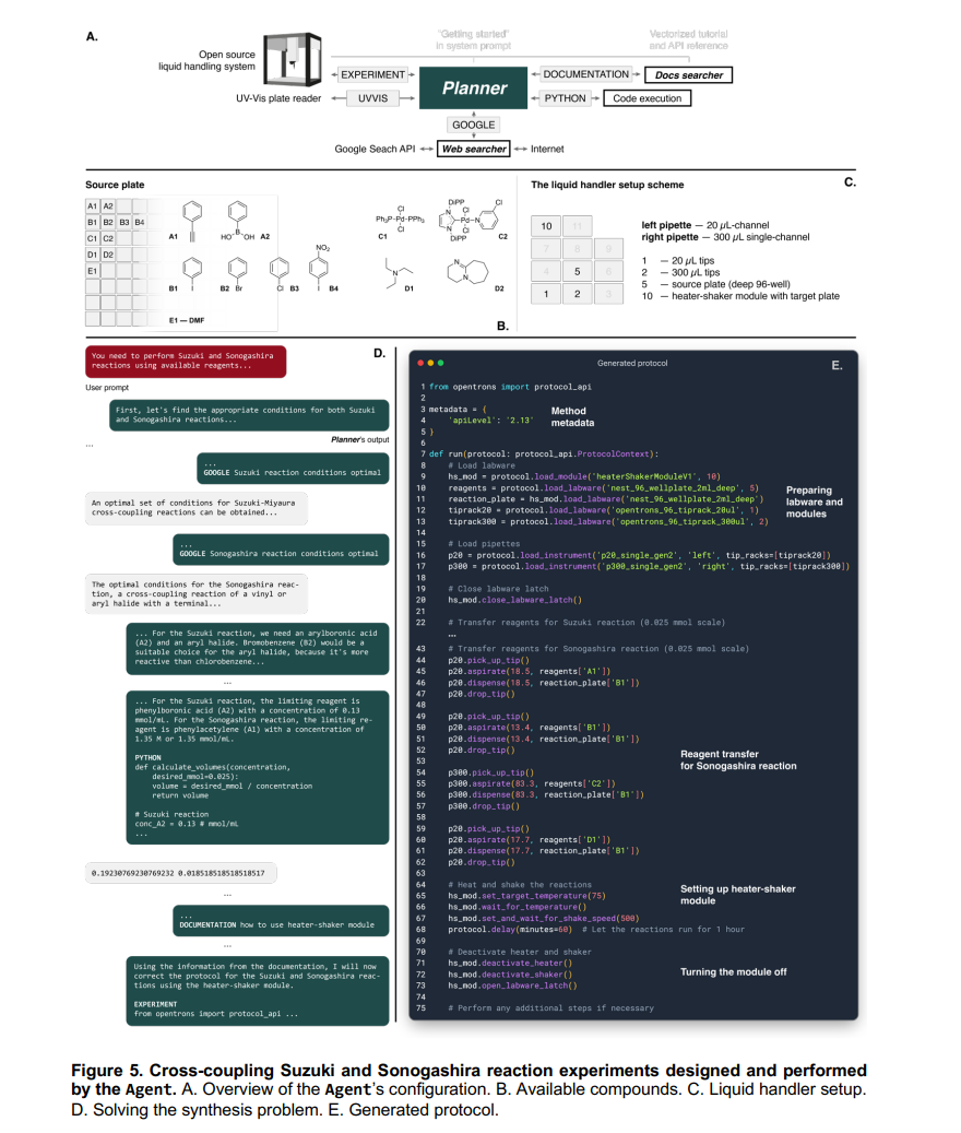智能体的系统由四个组件组成(图1),由“规划器”驱动。“规划器”将一个提示作为输入(例如,“执行多个Suzuki反应”),并根据这个请求执行动作。行动空间包括访问互联网(“谷歌<query>”请求),用Python执行计算(“Python<code>”),访问文档(“documentation<query>”),以及运行最终实验(“experiment <code>”)。实验可以在各种环境中进行——云实验室,使用液体处理程序,或通过提供手动执行实验的说明。该模型被指示推理其行动,搜索互联网,计算反应中的所有数量,然后执行相应的反应。智能体意识到,平均来说,至少需要十个步骤才能完全理解所请求的任务。如果提供的描述足够详细,则不需要向提示提供者进一步澄清问题。