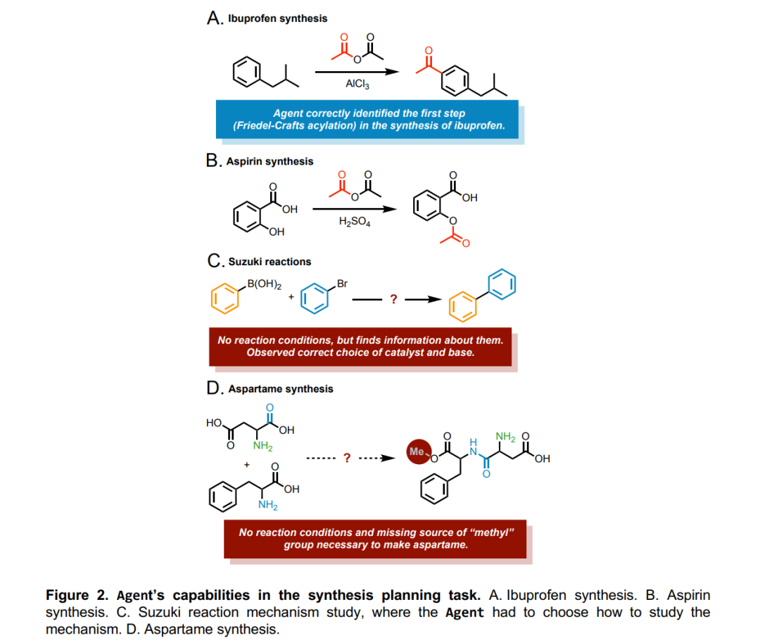 系统能力的另外两个例子包括普通阿司匹林的合成(图2B和附录B)和阿斯巴甜的合成(图2D和附录C),前者是模型有效搜索和设计的,后者虽然缺少产品中的甲基,但一旦模型收到合适的合成示例,在云实验室中执行,就可以纠正。此外,当被要求研究一个Suzuki反应时,该模型准确地识别了底物和产物(图2C和附录D)。当建议特定的催化剂或碱时,用于文本生成的高温参数会导致波动。