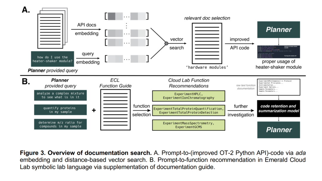 大型语言模型有可能通过生成非专家更容易访问的软件文档的自然语言描述来克服这一障碍。这些模型是在来自各种来源的大量文本语料库上进行训练的,这些语料库包括与应用程序编程接口(API)相关的大量信息。其中一个这样的API是Opentrons Python API.16然而,GPT-4的训练数据包含截至2021年9月的信息。因此,有可能提高智能体使用API的准确性。为此,我们设计了一种方法来为智能体提供给定任务所需的文档,总结在图3A中。