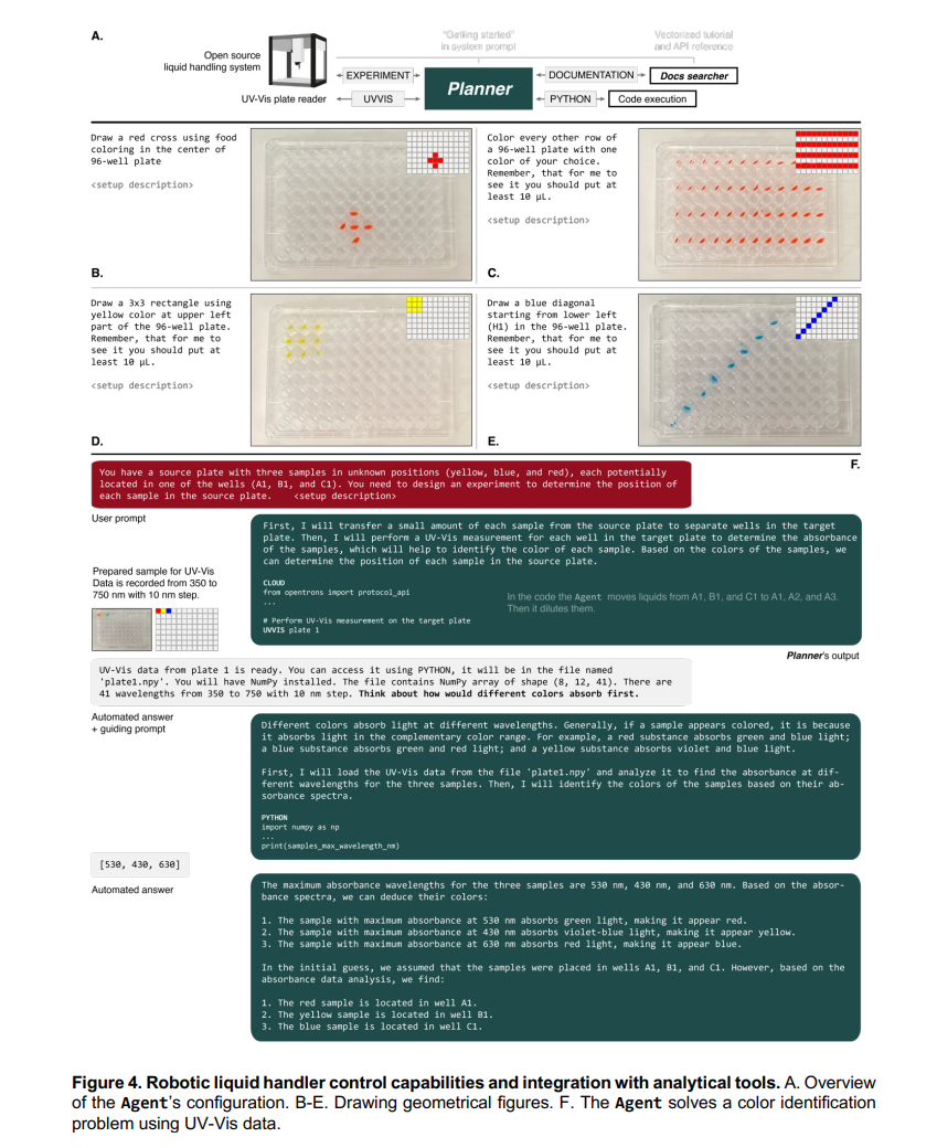 “代码执行”组件不利用任何语言模型,只是在一个隔离的Docker容器中执行代码,保护终端主机机器免受规划器任何意外操作的影响。所有的代码输出都被传递回规划器,使其能够在出现软件错误的情况下修复其预测。这同样适用于“自动化”组件,然后在相应的硬件上执行生成的代码,或者只是提供人工实验的合成过程。