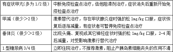 PD-1抑制剂治疗时应监控免疫相关表现(irAEs),炎症反应可影响任一器官组织。irAEs多持时较短,偶有致病,SCCHN PD-1抑制剂研究中3/4级毒性发生率13%,皮肤毒性最常见,包括皮疹、瘙痒、皮肤干燥、白斑和口腔粘膜炎,多数轻度,局部滋润剂即可,无需停药,3/4级皮疹应暂停治疗,局部或全身激素治疗;内分泌疾病包括垂体炎、肾上腺功能不足、甲亢、甲减,既往RT者发生率更高,甲减较甲亢常见,每次治疗前或至少一月一次甲功检查,亚临床甲减给予替代治疗,无需停用治疗,多不需剂量调整。下表是ESMO免疫相关内分泌疾病推荐。